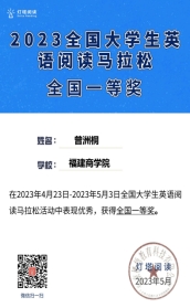 在为期10天(4月23日8点—5月3日8点)的2023全国大学生英语阅读马拉松活动中,bat365学生积极参与,认真阅读答题,取得非常优异的成绩。其中,2020级商务英语专业曾洲桐同学获全国一等奖且排名第一,同样来自2020级商务英语专业的张婕和张雅龙同学获全国二等奖,来自2022级商务英语专业的程俊炜同学获全国三等奖。