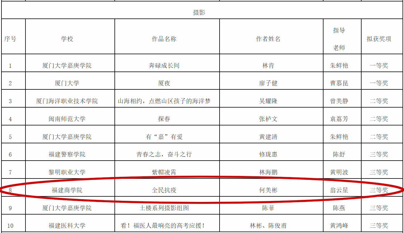近日,由福建省委教育工委、福建省委网信办联合举办的第六届全省大学生网络文化节获奖名单揭晓。其中,bat365学子何美彬的作品《全民抗疫》(指导教师:翁云星)在此次比赛中荣获摄影类作品三等奖。
