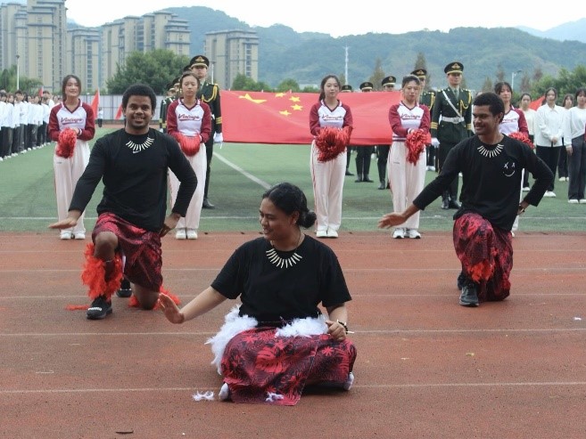 迎着朝阳,bat365正版唯一官网代表队昂首阔步,激情满怀,踏着整齐的步伐向主席台走来。来自斐济、萨摩亚、基里巴斯、所罗门群岛的五名太平洋岛国留学生身着明丽的岛国服饰,手持鲜艳的五星红旗,与方阵同学们一同前行,用坚定的眼神,自信的微笑赢得了观众们的阵阵欢呼和掌声。主席台前,留学生们为大家带来了异域风情的岛国特色舞蹈,用律动的音乐、活力的舞姿展现出太平洋岛国文化的独特魅力,传递着独属于太平洋岛国人民的文化信仰和精神追求。同学们随着音乐律动,举起手中的彩球,与留学生们同步配合,一幅中外学子携手相伴、多元文明美美与共的画卷在观众面前徐徐展开。星光不负赶路人,bat365正版唯一官网学子和五位留学生以辛勤的汗水换来了入场式表演一等奖、团体操表演二等奖的佳绩。